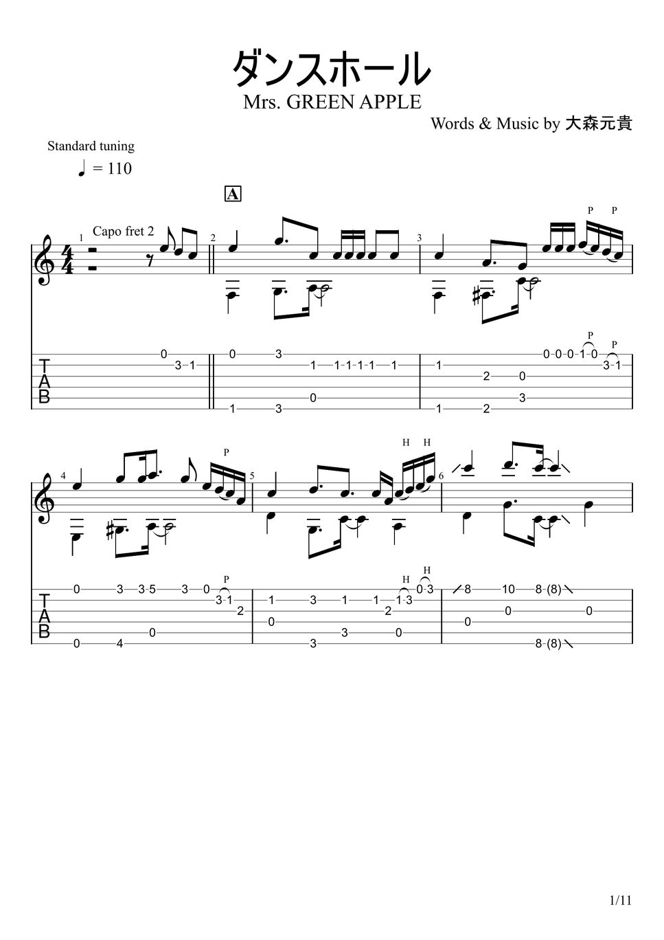 Mrs. GREEN APPLE Dance Hall (Fingerstyle) Sheets by u3danchou